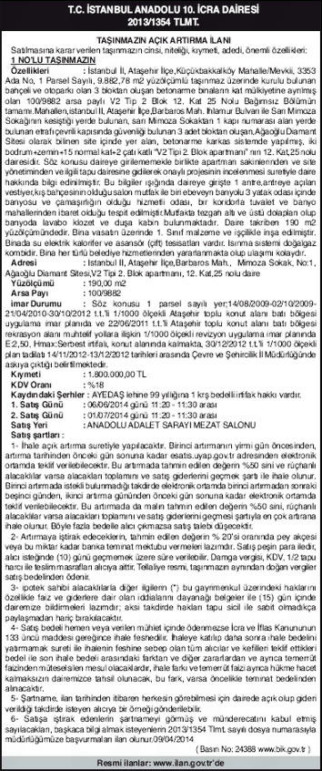 İstanbul Anadolu 10. İcra Dairesi, 1 milyon 800 bin lira bedelle Ağaoğlu Diamond Ataşehir'de konut satıyor. 190 metrekare büyüklüğe sahip konutun ihalesi 6 Haziran 2014 günü saat 11.20 ile 11.30 arası Anadolu Adalet Sarayı'nda gerçekleştirilecek. Alıcı çıkmaması durumunda ikinci satış 1 Temmuz 2014 günü aynı yer ve saatte yapılacak.