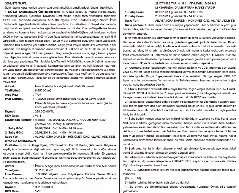 Aliağa İcra Dairesi’nden satılık 1.1 milyon liraya 2 tarla!