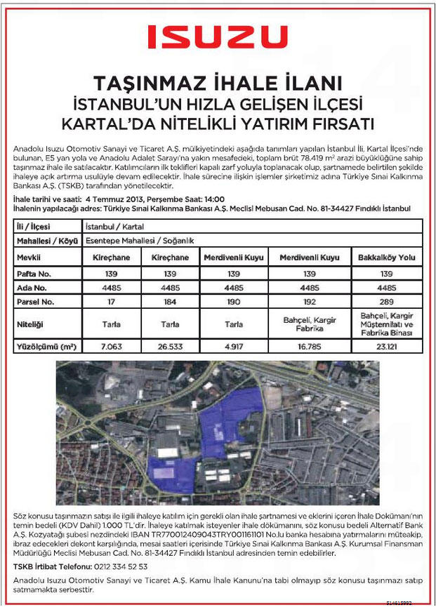 Anadolu Isuzu Otomotiv Sanayi ve Ticaret A.Ş., İstanbul ili, Kartal ilçesinde bulunan 5 adet taşınmazı satmak üzere ihale düzenledi