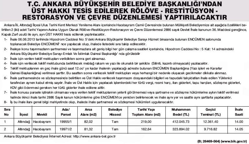 Ankara Büyükşehir Belediyesi, Altındağ ilçesi Ulus Tarihi Kent Merkezi Yenileme Alanı içerisinde yer alan iki yapıyı restore ettirecek. Üst hakkı tesis edilerek rölöve, restitüsyon, restorasyon ve çevre düzenleme işini kapsayan ihalenin toplam tahmini bedeli 735 bin 939 lira olarak belirlendi. İhale 6 Haziran 2013 günü saat 14.00 ve 14.05'te Ankara Büyükşehir Belediyesi'nde yapılacak.