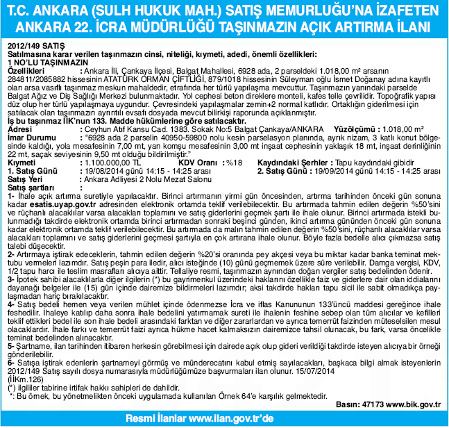 Ankara Sulh Hukuk Mahkemesi'nin Çankaya Balgat Mahallesi'nde satışa çıkardığı 1.018 metrekare yüzölçümlü arsanın tahmini bedeli 1 milyon 100 bin lira olarak belirlendi. Söz konusu arsanın ihalesi 19 Ağustos 2014 günü saat 14:15 ile 15:25 arası Ankara Adliyesi'nde açık artırma yöntemiyle gerçekleşecek. Alıcı çıkmaması durumunda ikinci satış 19 Eylül 2014 günü aynı yer ve saatte tekrarlanacak.