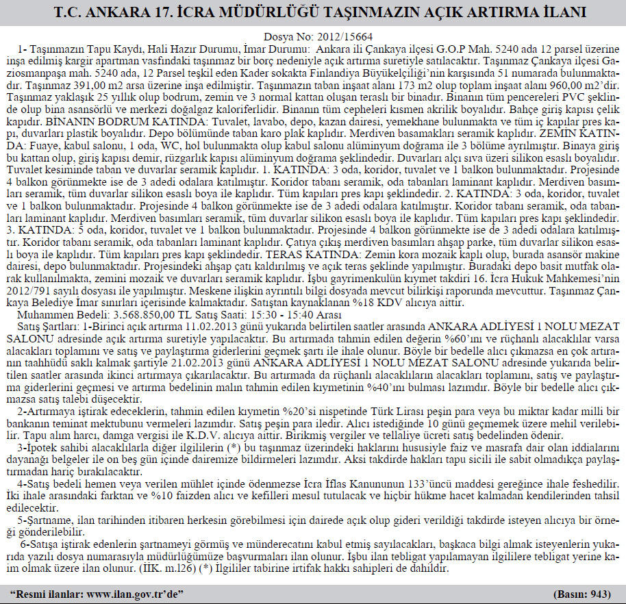 Ankara 17. İcra Müdürlüğü, Gaziosmanpaşa Mahallesi sınırlarında kalan apartmanı icradan satışa çıkardı. Finlandiya Büyükelçiliği karşısında yer alan apartman 391 metrekarelik arsa üzerinde inşa edilmiş. Bodrum+3 normal kat+ teras katından meydana gelen binanın tahmini bedeli 3 milyon 568 bin 850 lira olarak belirlendi. Satışa çıkarılan taşınmazın ihalesi 11 Şubat 2013 günü saat 15.30 ile 15.40 arası Ankara Adliyesi'nde yapılacak. Alıcı çıkmaması durumunda ise ikinci satış 21 Şubat 2013 günü aynı yer ve saatte gerçekleşecek.