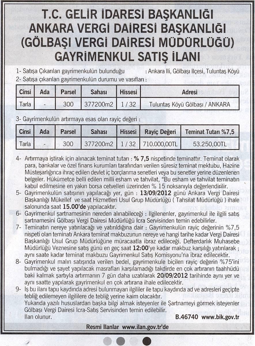 Ankara Gölbaşı Vergi Dairesi Müdürlüğü, Tuluntaş Köyü sınırları içerisinde yer alan 377 bin 200 metrekarelik arsayı 710 bin lira tahmini bedelle satışa çıkardı. Geçici teminatı 53 bin 250 lira olarak belirlenen arsanın ihalesi 13 Eylül 2012 günü saat 15.00'da Ankara Vergi Dairesi Başkanlığı'nda yapılacak. İlk satış sürecinde alıcı çıkmaması durumunda ikinci ihale 20 Eylül 2012 günü aynı yer ve saatte yapılacak.