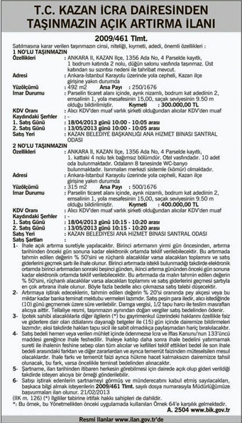 Ankara Kazan İcra Dairesi 492 metrekare alanlı düğün salonu ve 10 odalı oteli icradan satışa çıkardı. İçerisinde su sızıntısı sebebiyle tadilat olan düğün salonunun tahmini bedeli 300 bin lira olarak belirlenirken 10 odalı otel için 400 bin lira fiyat biçildi. Satışa çıkarılan taşınmazların ihalesi 18 Nisan 2013 günü saat 10.00 ile 10.05 arası Kazan Belediyesi'nde yapılacak. Alıcı çıkmaması durumunda ikinci satış 13 Mayıs 2013 günü aynı yer ve saatte gerçekleşecek.