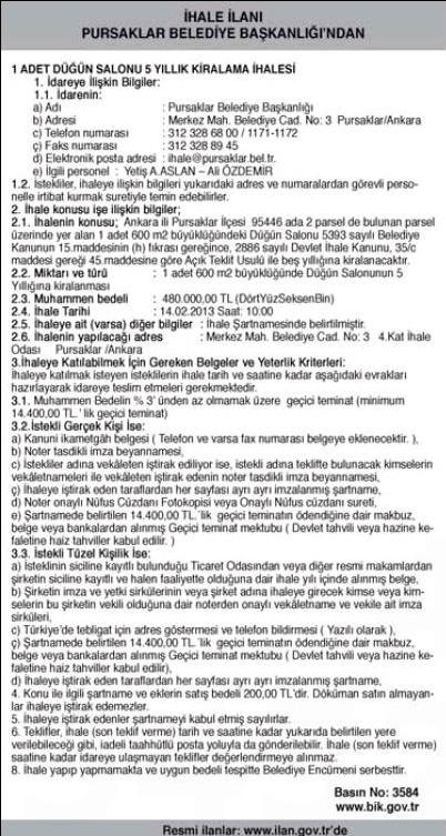 Ankara Pursaklar Belediyesi, 600 metrekare alanları düğün salonunu 5 yıllığına 480 bin liraya kiralıyor. Kiraya verilecek olan düğün salonunun ihalesi 14 Şubat 2013 günü saat 10.00'da Pursaklar Belediyesi'nde yapılacak.