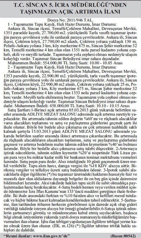 Ankara Sincan 5. İcra Müdürlüğü, Temelli köyü sınırlarında kalan 2 arsayı satışa çıkardı. Tahmini bedelleri 458 bin lira ve 554 bin lira olarak belirlenen iki arsa toplam 1 milyon 12 bin liralık değere sahip. 27 bin 700 ve 22 bin 900 metrekare alana sahip arsaların ihalesi 5 Mart 2013 günü saat 10.10 ile 10.15 arasında Sincan Adliyesi'nde yapılacak. Alıcı çıkmaması durumunda ikinci satış 15 Mart 2013 günü aynı yer ve saatte yapılacak.