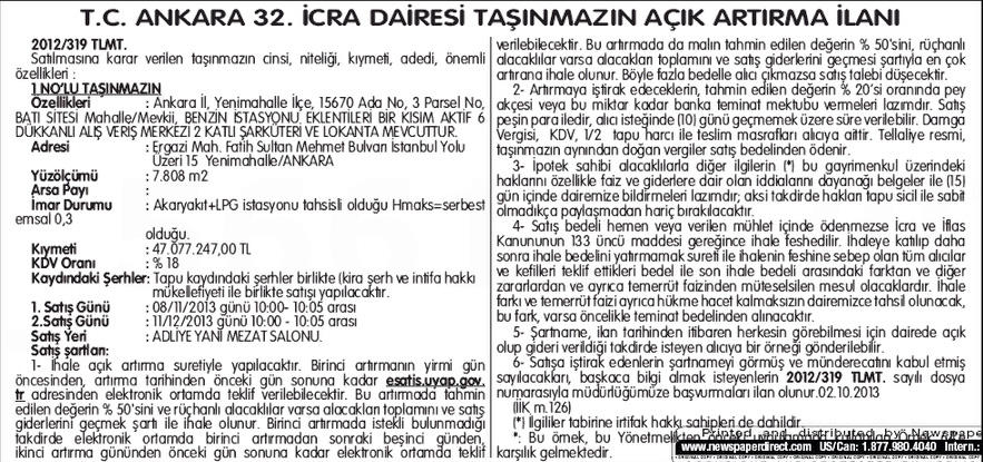Ankara 32. İcra Dairesi Yenimahalle'de alışveriş merkezi ile akaryakıt+LPG istasyonu satıyor. Tahmini bedeli 47 milyon 77 bin 247 lira olan ihalenin KDV oranı yüzde 18 olarak belirlendi. 7 bin 808 metrekare arsa üzerinde inşa edilmiş olan taşınmazların ihalesi 8 Kasım 2013 günü saat 10.00 ile 10.05 arasında yapılacak. Alıcı çıkmaması durumunda ikinci satış 11 Aralık 2013 günü aynı yer ve saatte gerçekleştirilecek.