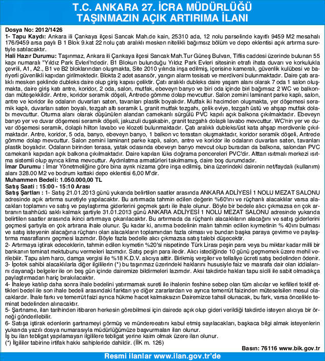 Ankara 27. İcra Müdürlüğü, Çankaya'daki Yıldız Park Evleri içerisinde iki daireyi 1 milyon 50 bin lira tahmini bedelle satışa çıkardı. 4 bloktan oluşan proje 2010 yılında inşa edildi. Satışa çıkarılan dairelerin ihalesi 21 Ocak 2013 günü saat 15.00 ile 15.10 arası Ankara Adliyesi'nde yapılacak. Alıcı çıkmaması durumunda ikinci satış 31 Ocak 2013 günü aynı yer ve saatte yapılacak.