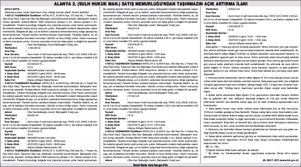 Antalya Alanya 2. Sulh Hukuk Mahkemesi, Oba Köyü sınırlarında kalan 5 parsel arsayı toplam 1 milyon 135 bin 920 lira bedelle satışa çıkardı. Tahmini bedelleri 184 bin 500 lira ile 250 bin 920 lira arasında değişen taşınmazların ihalesi 5 Haziran 2013 günü saat 09.30 ile 10.30 arası Alanya Adliyesi'nde yapılacak. Alıcı çıkmaması durumunda ikinci satış 5 temmuz 2013 günü aynı yer ve saatte gerçekleştirilecek.