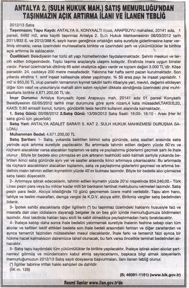 Antalya 2. Satış Memurluğu, Konyaaltı Arapsuyu bölgesinde yer alan 5 bin 492 metrekarelik arsayı üzerinde yer alan ağaçlarla birlikte 4 milyon 671 bin lria tahmini bedelle satışa çıkardı. Üzerinde 85 adet sık dikilmiş okaliptüs ağacının yer aldığı arsanın ihalesi 3 Eylül 2012 günü saat 16.00 ile 16.10 arası Antalya Adalet Sarayı'nda yapılacak. Alıcı çıkmaması durumunda ise ikinci satış 13 Eylül 2012 günü aynı yer ve saatte yapılacak.
