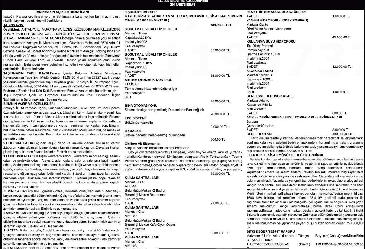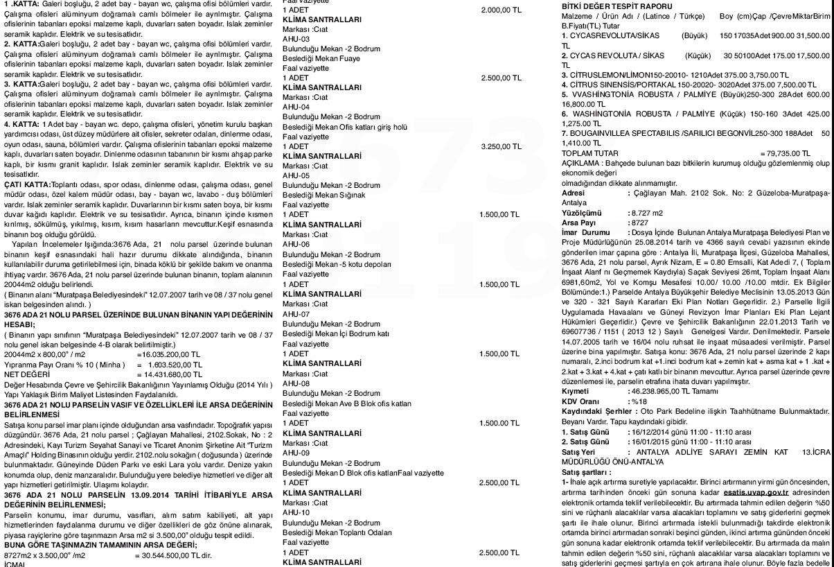 Güzeloba Mahallesi, 3676 ada, 21 nolu parselde yer alan 8 bin 727 metrekare yüz ölçüme sahip betonarme bina ve arsasının toplam tahmini bedeli 46 milyon 238 bin 965 lira olarak açıklandı. Söz konusu gayrimenkulün ihalesi 16 Aralık 2014 günü saat 11.00 ile 11.00 arası Antalya Adliye Sarayı'nda açık artırma yöntemiyle gerçekleştirilecek. Alıcı çıkmaması durumunda ikinci satış 16 Ocak 2015 günü aynı yer ve saatte tekrarlanacak.
