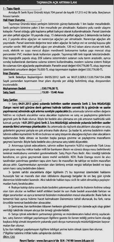 Antalya Serik 2. İcra Müdürlüğü, 530 bin 776 liraya tek katlı daire ve arsasını satıyor. Arazi değeri 454 bin 776 lira olan tarlanın üzerindeki yapı ise 76 bin lira değere sahip. Toplam tahmini bedeli 530 bin 776 lira olan taşınmazların ihalesi 4 Ocak 2013 günü saat 15.30 ile 15.40 arası Serik 2. İcra Müdürlüğü'nde yapılacak. Alıcı çıkmaması durumunda ikinci satış 14 Ocak 2013 günü aynı yer ve saatte gerçekleşecek.