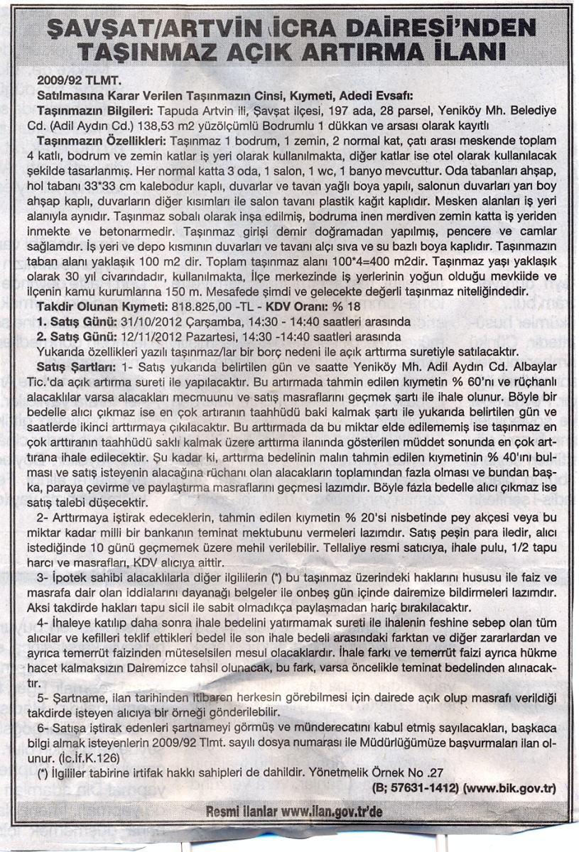 Artvin Şarşavi’de icradan satılık bina ve arsa! 818 bin lira!