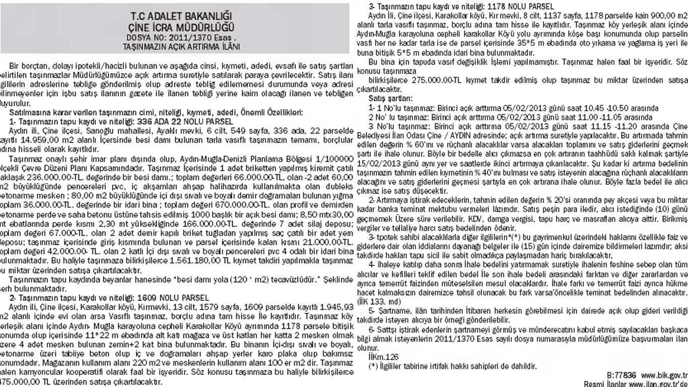 Çine İcra Müdürlüğü, Aydın Çine'nin Sanoğlu Mahallesi ve Karakollar Köyü'nde bulunan 3 binayı ihale ile satacak. Taşınmazların değerleri, 1 milyon 561 bin 180 TL, 275 bin TL ve 475 bin TL olarak açıklandı. İhale, 05.02.2013 tarihinde saat 10.45 ila 11.20'de Çine Belediyesi İlan Odası Çine/Aydın adresinde yapılacak.