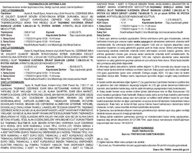 Aydın'da satışa çıkarılan açık benzin istasyonunun tahmini bedeli 1 milyon 275 bin 468 lira olarak belirlendi. KDV'si 18 olan taşınmazın ihalesi 17 Şubat 2014 tarihinde saat 11:10 ile 11:20 arası Nazilli Adliyesi Nazilli 2. İcra Müdürlüğü önü Mezat Salonu'nda yapılacak. İhaleye alıcı çıkmaması durumunda ikinci satış 17 Mart 2014 tarihinde aynı yer ve saatte yapılacak.