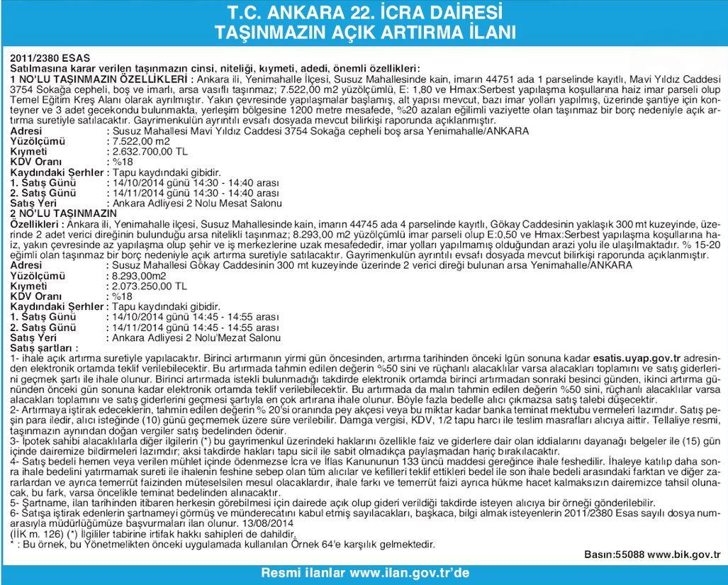 Ankara 22. İcra Dairesi, iki parsel arsayı satışa çıkardı. Fiyatları 2 milyon 73 bin 250 lira ve 2 milyon 632 bin 700 lira olarak belirlenen taşınmazların büyüklüğü 7 bin 522 metrekare ve 8 bin 293 metrekare. Ankara Yenimahalle ilçesi, Susuz Mahallesi'nde yer alan arsaların ihalesi 14 Ekim 2014 günü saat 14.30 ile 14.55 arasında Ankara Adliyesi'nde gerçekleştirilecek. Alıcı çıkmaması durumunda ikinci satış 14 Kasım 2014 günü aynı yer ve saatte yapılacak.