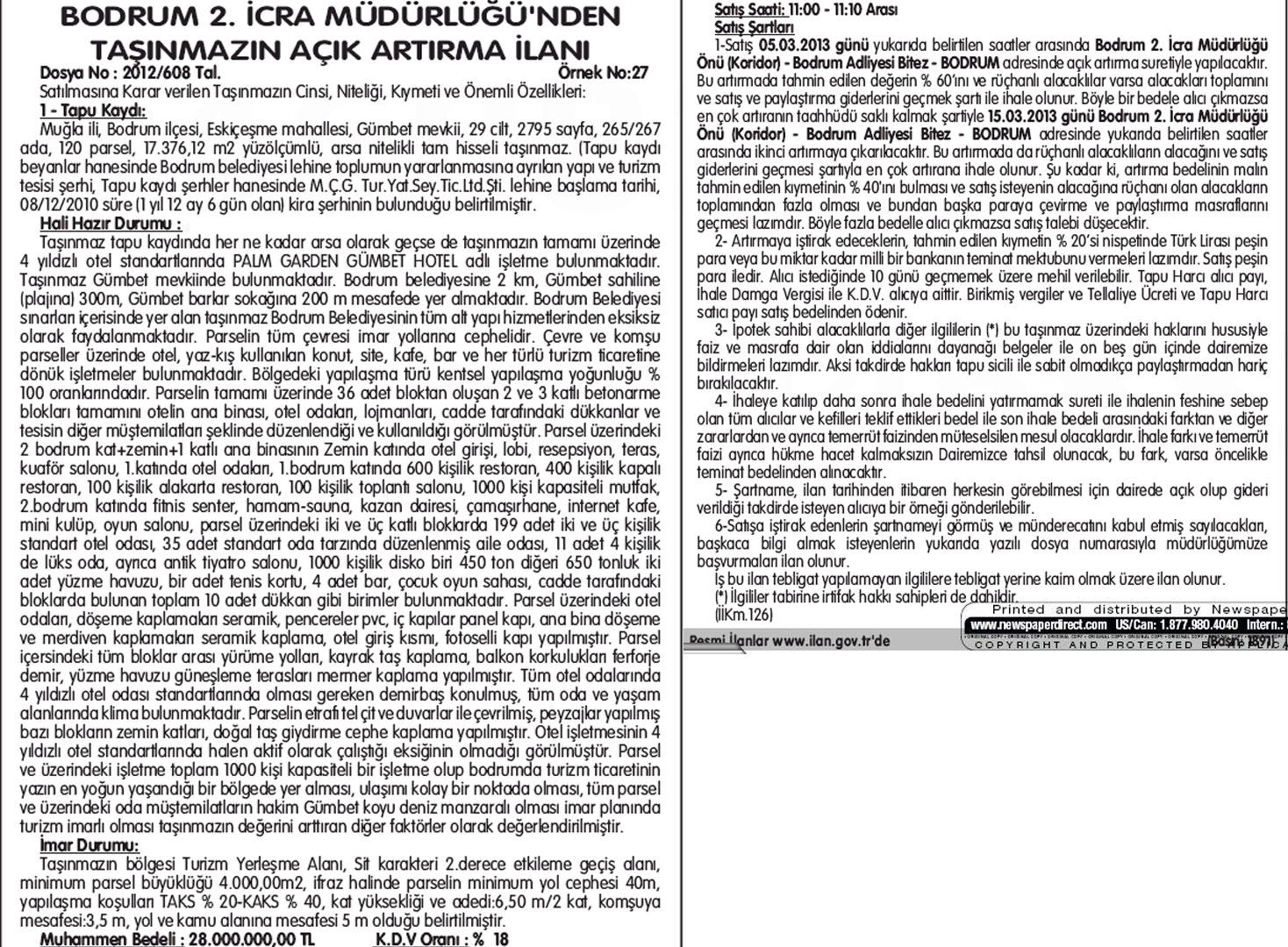 Bodrum 2. İcra Müdürlüğü, Muğla ili, Bodrum ilçesi, Eskiçeşme Mahallesi, Gümbet mevkiinde bulunan 17.376,12 metrekarelik Palm Garden Gümbet Hotel adlı taşınmazı satmak üzere ihale düzenledi. 4 yıldızlı otel standartlarında olan taşınmazın muhammen bedeli 28 milyon TL olarak belirledi. İhale, 05.03.2012 tarihinde saat 11.00'de Bodrum 2. İcra Müdürlüğü önü (Koridor)-Bodrum Adliyesi Bitez-Bodrum adresinde yapılacak.