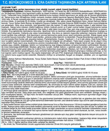 Beylikdüzü Gürpınar'da yer alan Golden Park Evleri'nde icradan satışa çıkarılan ev, 130 metrekare net kullanım alanına sahip bulunuyor. Satışa çıkarılan Golden Park Evleri A Blok Daire 28'in tahmini fiyatı 285 bin lira olarak kayıtlarda yerini aldı. Satış Büyükçekmece 3. İcra Müdürlüğü'nde 14 Kasım 2013 tarihinde gerçekleşecek.
