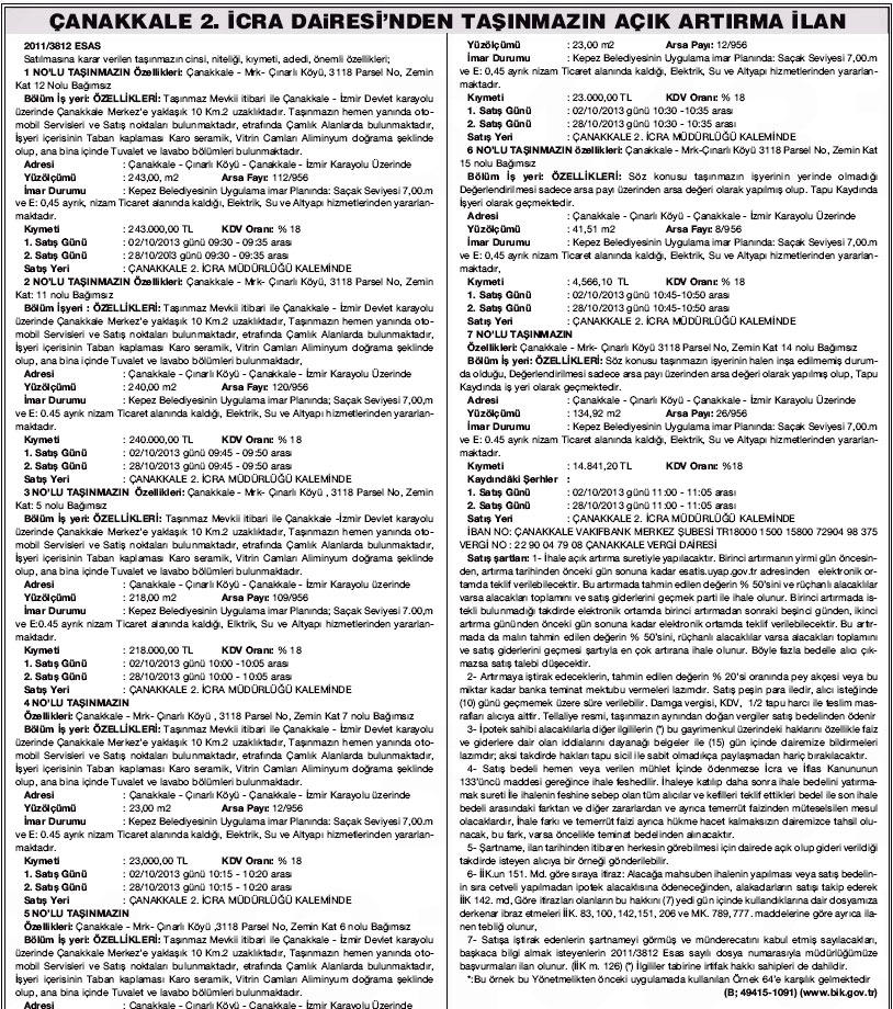 Çanakkale 2. İcra Müdürlüğü tarafından satışa çıkarılan taşınmazların tahmini değerleri 14 bin 841 lira ile 243 bin lira arasında farklılık gösteriyor. Taşınmazların satışı 2 Ekim 2013 tarihinde saat Çanakkale 2. İcra Müdürlüğü'nde 09.35'te başlayarak devam edecek.