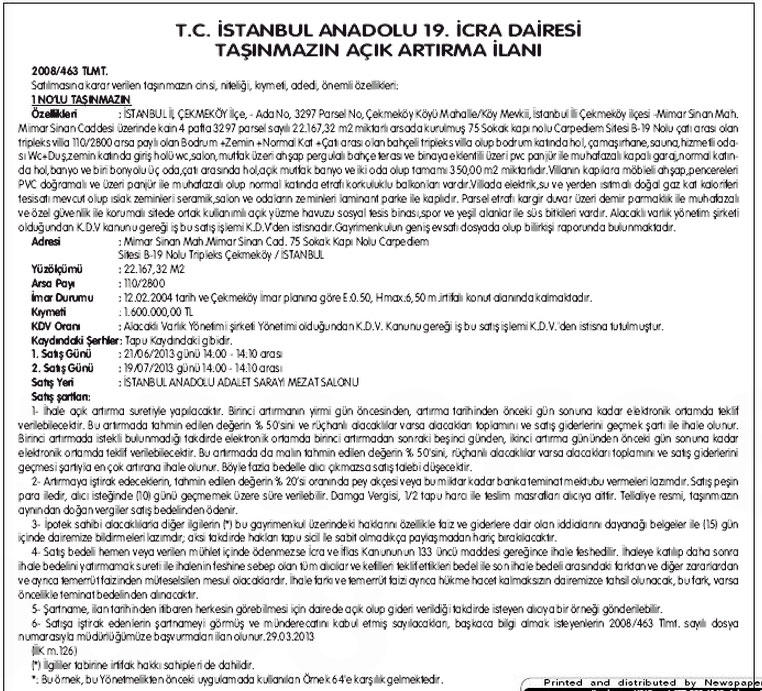 İstanbul Anadolu 19. İcra Dairesi, Çekmeköy Carpe Diem Sitesi'nde bulunan tripleks villayı ihale ile satacak. Taşınmazın muhammen bedeli 1 milyon 600 bin lira olarak belirlendi. İhale, 21.06.2013 tarihinde saat 14:00'te İstanbul Anadolu Adalet Sarayı Mezat Salonu'nda yapılacak.