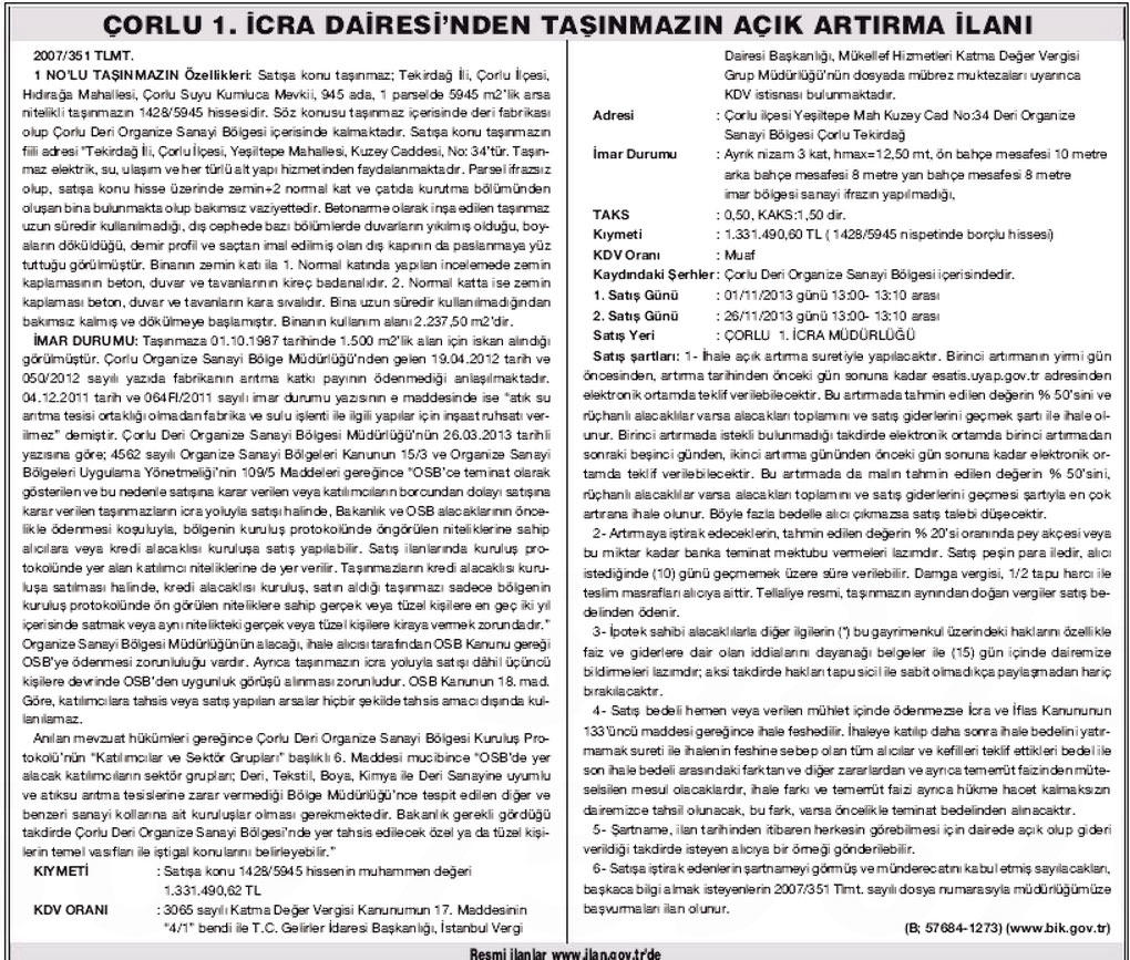 Çorlu 1. İcra Dairesi Hıdırağa Mahallesi'nde satışa çıkarılan deri fabrikasının tahmini fiyatı 1 milyon 331 bin 490 lira olarak kayıtlara girdi. Fabrikanın satışı 1 Kasım 2013 tarihinde saat 13.00'te Çorlu 1. İcra Müdürlüğü'nde gerçekleşecek.