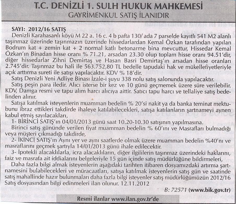 Denizli 1. Sulh Hukuk Hakimliği tarafından ortaklığın giderilmesi için satışa çıkarılan binanın yüzde 94.51'i Kemal Özkan'a, yüzde 2.745'şeri ise Zihni Demirtaş ve Hasan Basri Demirtaş'a ait bulunuyor. Tahmini değeri 563 bin 752 lira+KDV olarak kayıtlara geçen taşınmazsın satışı 4 Ocak 2013 tarihinde saat 10.20'de Denizli Yeni Adliyesi'nde gerçekleştirilecek.