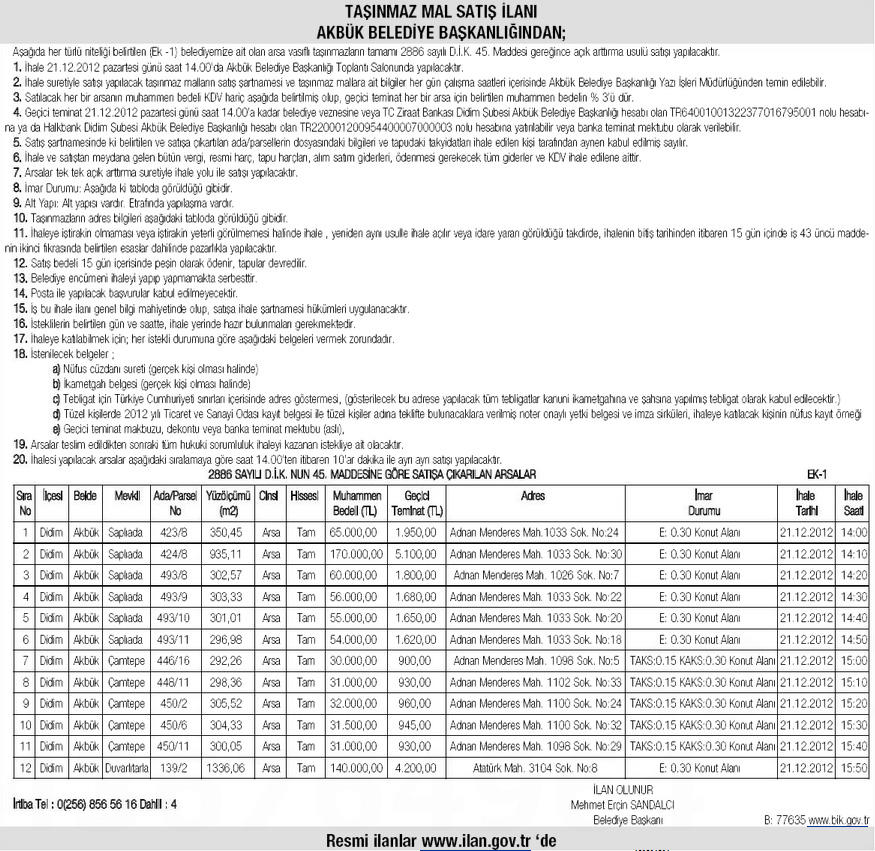 Tamamı konut imarlı olan arsaların ihalesi 21 Aralık 2012 günü saat 14.00 ile 15.50 arası Akbük Belediyesi Toplantı Salonu'nda yapılacak.