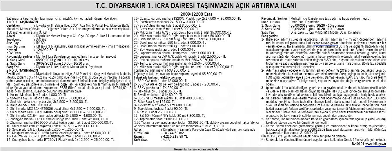 Diyarbakır 1. İcra Dairesi, 150 metrekarelik daire ve fabrika satıyor. Toplam tahmini bedeli 4 milyon 341 bin 151 lira olan gayrimenkullerin KDV oranı yüzde 18 olarak belirlendi. İhale 5 Eylül 2013 günü saat 10.00 ile 10.10 arası Diyarbakır 1. İcra Dairesi'nde gerçekleştirilecek. Alıcı çıkmaması durumunda ikinci satış 30 Eylül 2013 günü aynı yer ve saatte yapılacak.