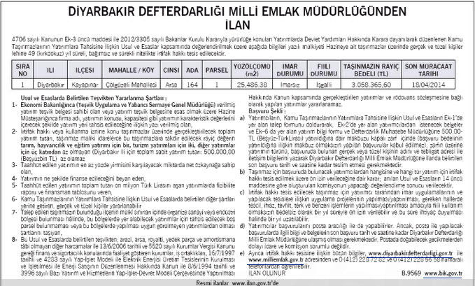 Diyarbakır Defterdarlığı'nın Kayapınar Çölgüzeli Mahallesi'nde kullanım hakkı verdiği 25 bin 486 metrekare yüzölçüme sahip arsanın tahmini bedeli 3 milyon 58 bin 365 lira olarak belirlendi. Üst kullanım hakkı verilen arsaya başvuru yapacaklar, son müracat tarihine (18 Nisan 2014) kadar evraklarını tamamlamaları gerekiyor .