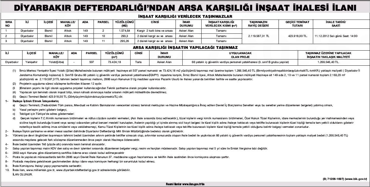 Diyarbakır Defterdarlığı, Bismil'de askeri alana imarlı 3 parsel arsada 66 yataklı personel yatakhanesi yaptıracak. 293 metrekare ile 1574 metrekare arası değişen arsaların rayiç bedeli 2 milyon 119 bin lira, geçici teminat bedeli ise 423 bin lira olarak açıklandı. 1 milyon 266 bin liraya mal edilecek yatakhane arsalarla birlikte toplamda 3 milyon 386 bin liralık tutara ulaşacak.