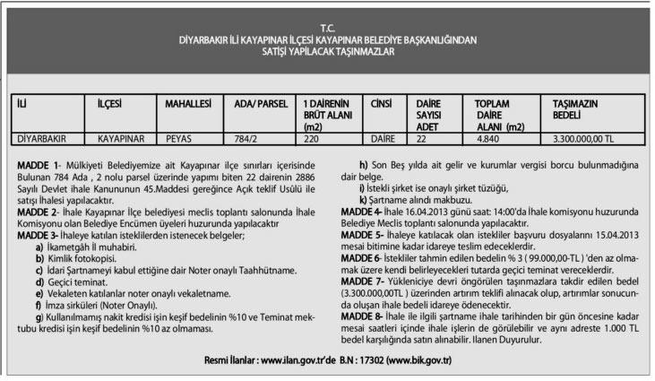 Kayapınar Belediye Başkanlığı; Diyarbakır ili, Kayapınar ilçesi, Peyas Mahallesi'nde bulunan 22 daireyi açık teklif usulü ile satacak