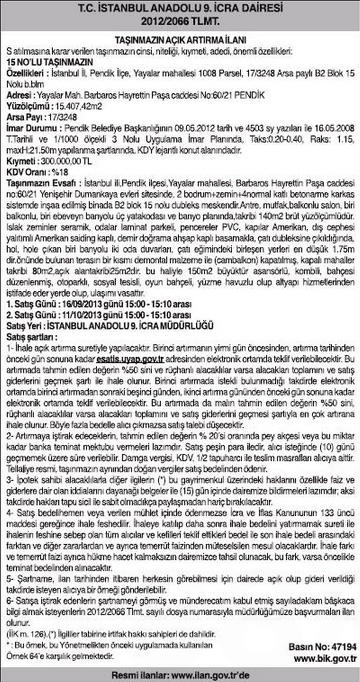 İstanbul Anadolu 9. İcra Dairesi Pendik'te yer alan Dumankaya Yenişehir Evleri'nde konut satışa sundu. 140 metrekare alana sahip olan dairenin dubleks tasarımlı. Tahmini bedeli 300 bin lira olarak belirlenen dairenin KDV'si yüzde 18. İhale 16 Eylül 2013 günü saat 15.00 ile 15.10 arası İstanbul Anadolu 9. İcra Müdürlüğü'nde gerçekleştirilecek. Alıcı çıkmaması durumunda ikinci satış 11 Ekim 2013 günü aynı yer ve saatte yapılacak.