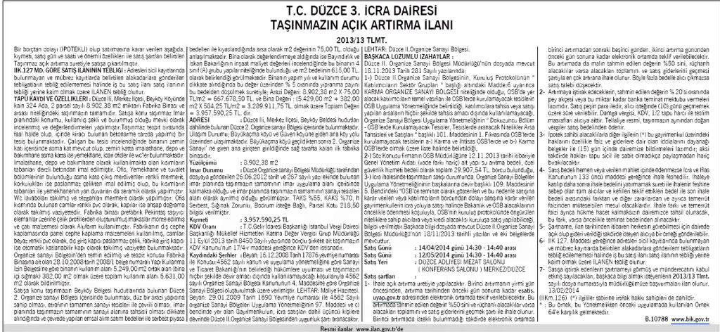 Düzce 3. İcra Dairesi'nin Beyköy Köyü'nde satışa çıkardığı 8 bin 902 metrekare yüzölçüme sahip fabrika binası ve arsasının tahmini bedeli 3 milyon 957 bin 590 lira olarak belirlendi. Düzce Beyköy Köyü'nde satışa konu olan fabrika binası ve arsasının ihalesi 14 Nisan 2014 günü saat 14:30 ile 14:40 arası Düzce Adliyesi Mezat Salonu'nda açık artırma yöntemiyle gerçekleşecek. Alıcı çıkmaması durumunda ikinci satış 12 Mayıs 2014 günü aynı yer ve saatte tekrarlanacak.