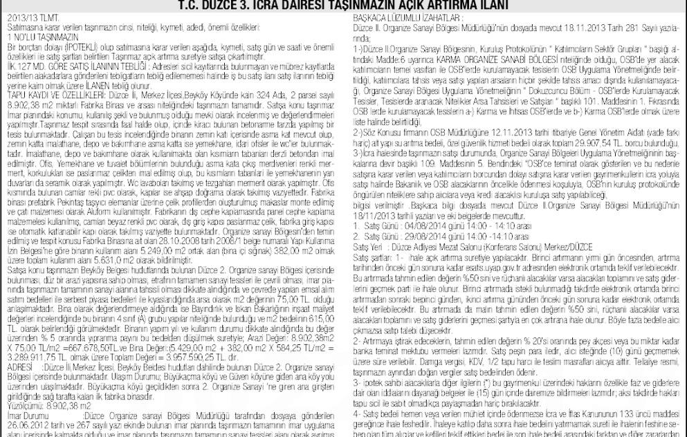 Düzce 3. İcra Dairesi'nin Beyköy Köyü'nde satışa çıkardığı, 8 bin 902 metrekare yüzölçüme sahip fabrika binası ve arsasının tahmini fiyatı 3 milyon 957 bin 590 lira olarak kayıtlara geçti. Satışa konu olan fabrika binası ve arsasının ihalesi 4 Ağustos 2014 günü saat 14:00 ile 14:10 arası Düzce Adliyesi'nde açık artırma yöntemiyle gerçekleşecek. Alıcı çıkmaması durumunda ikinci satış 29 Ağustos 2014 günü aynı yer ve saatte tekrarlanacak.