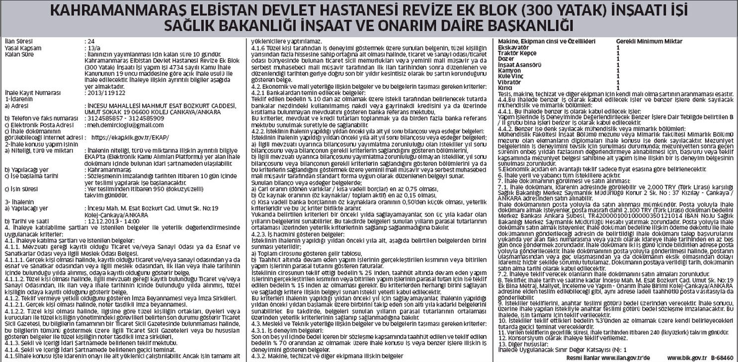 Sağlık Bakanlığı tarafından Kahramanmaraş Elbistan Devlet Hastanesi'ne 300 yataklı bir ek blok yaptırılacak. Detaylı bilgilerin EKAP'ta yer aldığı ihale 12 Aralık 2014 tarihinde saat 14.00'te İncesu Mahallesi M. Esat Bozkurt Caddesi Umut Sokak No 19 Kolej Çankaya Ankara adresinde gerçekleştirilecek.