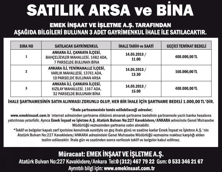 Emek İnşaat Ankara Çankaya ve Yenimahalle'de gayrimenkuller satıyor. Çankaya'da satışa sunulan iki binanın toplam tahmini bedeli 800 bin lira olarak belirlenirken Yenimahalle'de yer alan arsa için 160 bin lira fiyat biçildi. Satışa sunulan gayrimenkullerin ihalesi 14 Mayıs 2013 günü saat 11.00, 13.30 ve 15.00'te yapılacak.