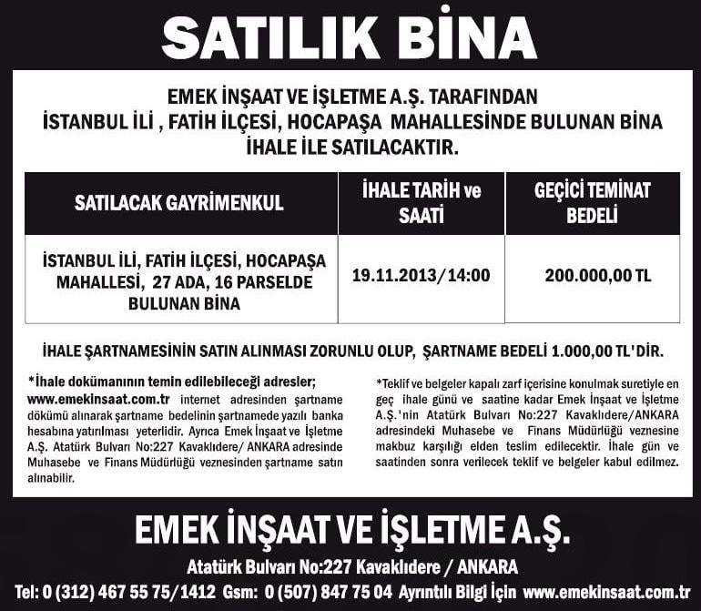 Emek İnşaat İstanbul Fatih'te bina satıyor. Geçici teminat bedeli 200 bin lira olan bina Hocapaşa Mahallesi sınırlarında yer alıyor. Taşınmazın ihalesi 19 Kasım 2013 tarihinde saat 14.00'te gerçekleştirilecek.