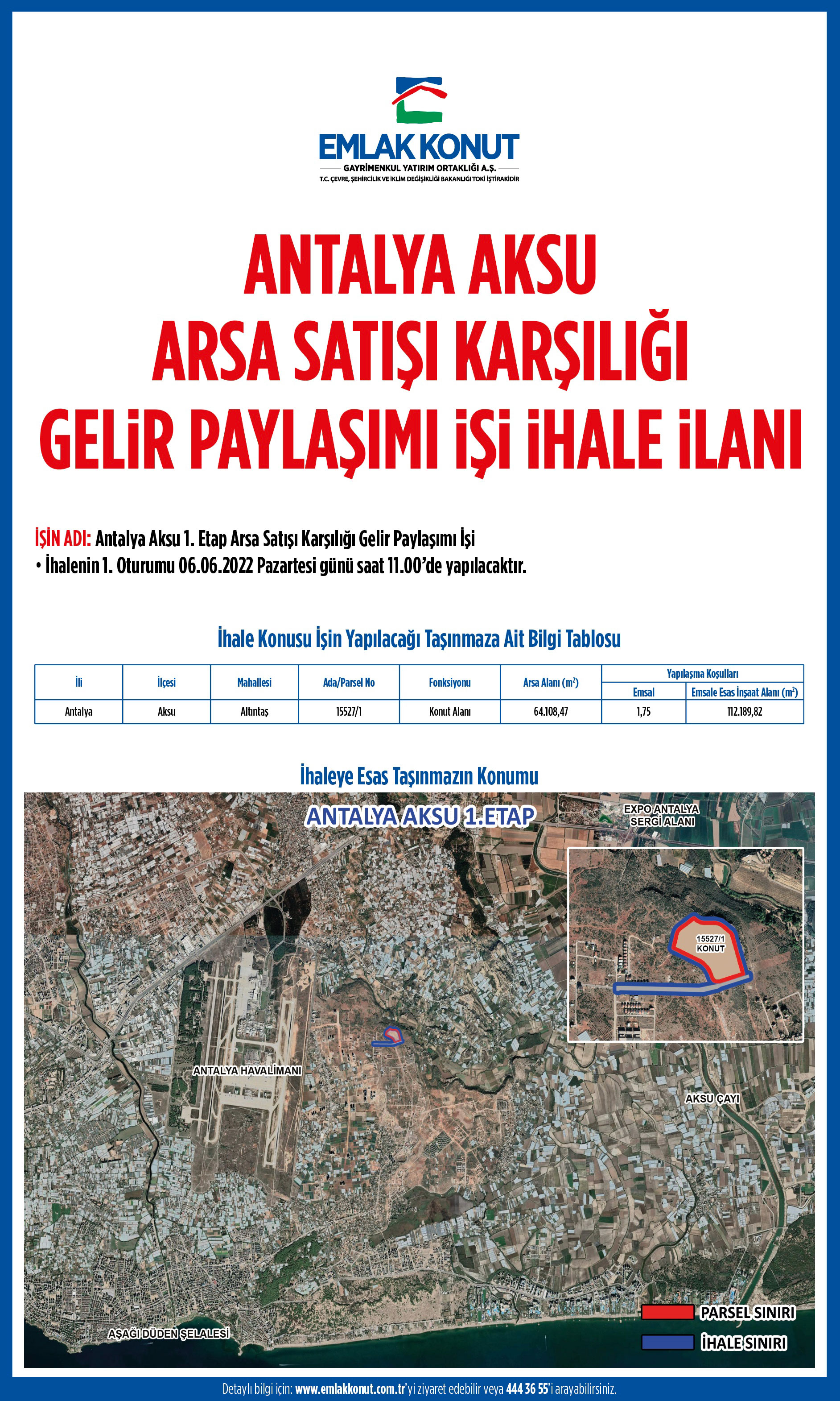 Emlak Konut GYO Antalya Aksu 1. Etap arsa ihalesinde ilk oturum 6 Haziran 2022 günü gerçekleştirilecek. Altıntaş Mahallesi sınırlarında yer alan konut imarlı parsel üzerinde 112 bin 189 metrekare inşaat izni bulunuyor.