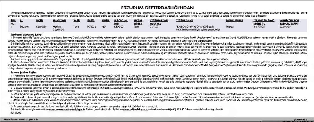 Erzurum Defterdarlığı, Köprüköy Merkez'deki 8 bin 500 metrekare yüzölçüme sahip tarla alanını 49 yıllığına kiraya verecek. Gayrimenkulün rayiç değeri 182 bin 799 lira olarak belirlendi. Yatırımcılar 2 Eylül 2014 tarihinde saat 17:00'e kadar başvuru yapabilirler.