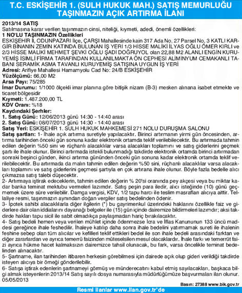 Eskişehir 1. Satış Memurluğu, Odunpazarı ilçesi sınırlarında kalan 66 metrekarelik dükkanı satışa çıkardı. Kuruyemiş satışına uygun olan dükkanın tahmini bedeli 1 milyon 487 bin 200 lira, KDV oranı ise yüzde 18 olarak belirlendi. Dükkanın ihalesi 12 Haziran 2013 günü saat 14.30 ile 14.40 arası Eskişehir 1. Sulh Hukuk Mahkemesi'nde yapılacak. Alıcı çıkmaması durumunda ikinci satış 8 temmuz 2013 günü aynı yer ve saatte gerçekleştirilecek.
