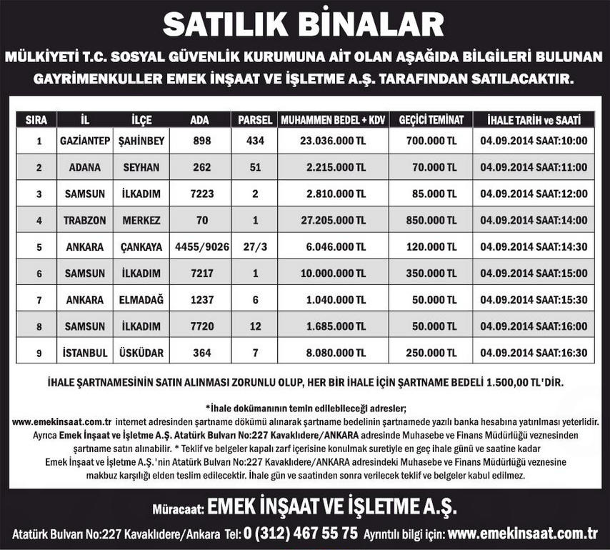 Emek İnşaat, portföyünde yer alan gayrimenkulleri satmaya devam ediyor. Son olarak Gaziantep, Adana, Samsun, Trabzon, Ankara ve İstanbul'da 9 taşınmazı satışa çıkaran Emek İnşaat ihale tarihini 4 Eylül 2014 olarak belirledi. Fiyatları 1 milyon 40 bin lira ile 27 milyon 205 bin lira arasında değişen taşınmazların toplam fiyatı 82 milyon 117 bin lira olarak belirlendi.