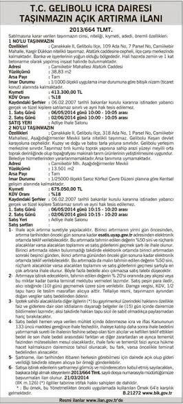 Çanakkale Gelibolu Camikebir Mahallesi'nde satışa çıkarılan 413 bin 300 lira değerindeki kargir bina için 6 Mayıs 2014 tarihinde 10.00-10.05 saatlerinde, 675 bin 50 lira değerindeki tarla için ise aynı tarihte 10.15-10.20 saatleri arasında Gelibolu Adliyesi'nde ihale gerçekleştirilecek.