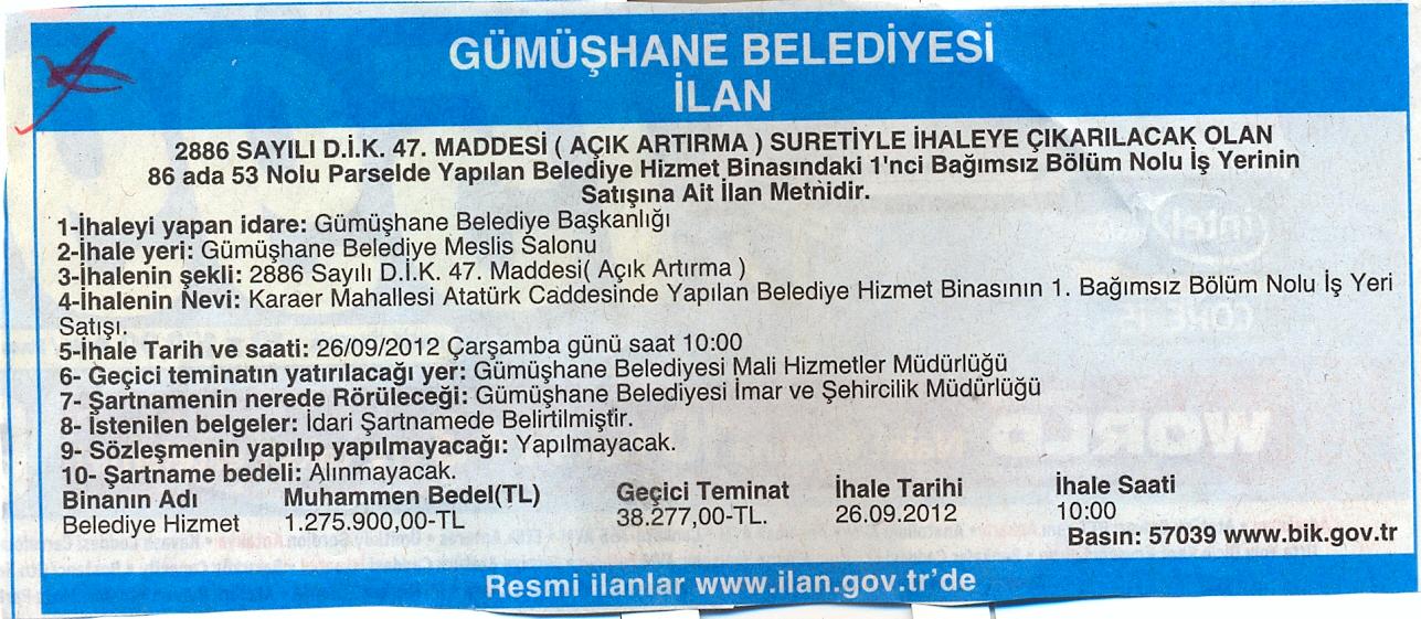 Gümüşhane Belediyesi, Hizmet Binası'nda yer alan 1 numaralı işyerini 1 milyon 275 bin lira tahmini bedelle satışa çıkardı. Satışa çıkarılan dükkanın geçici teminat bedeli ise 38 bin 277 lira olarak belirlendi. Karaer Mahallesi sınırları içerisinde yer alan işyerinin ihalesi 26 Eylül 2012 Çarşamba günü saat 10.00'da Gümüşhane Belediyesi Meclis Salonu'nda yapılacak.