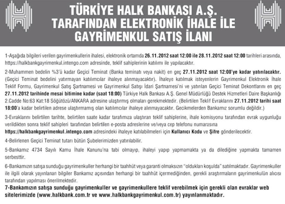 Gayrimenkullerin ihalesi, elektronik ortamda 26.11.2012 saat 12.00 ile 28.11.2012 saat 12.00 tarihleri arasında http://halkbankgayrimenkul.intengo.com adresinde teklif sahiplerinin katılımı ile yapılacak.