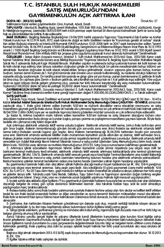 İstanbul Sulh Hukuk Mahkemeleri Satış Memurluğu, Beşiktaş Levent Mahallesi'nde 9 milyon liraya bina satıyor. 1065 metrekare alana sahip olan binanın ihalesi 18 Mart 2014 günü saat 10.30 ile 10.40 arası İstanbul Adalet Sarayı'nda gerçekleştirilecek. Alıcı çıkmaması durumunda ikinci satış 18 Nisan 2014 günü aynı yer ve saatte gerçekleştirilecek.