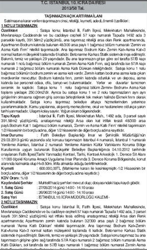 İstanbul 10. İcra Dairesi'nin Fatih'te satışa çıkarılan 391 metrekare yüzölçüme sahip asma katlı 2 dükkanın toplam tahmini bedeli 950 bin lira olarak belirlendi. Satışa konu gayrimenkullerin ihaleleri 27 Mayıs 2014 günü saat 14:00 ile 14:30 arası İstanbul 10. İcra Müdürlüğü kaleminde açık artırma yöntemiyle gerçekleşecek. Alıcı çıkmaması durumunda ikinci ihale 26 Haziran 2014 günü aynı yer ve saatte tekrarlanacak.