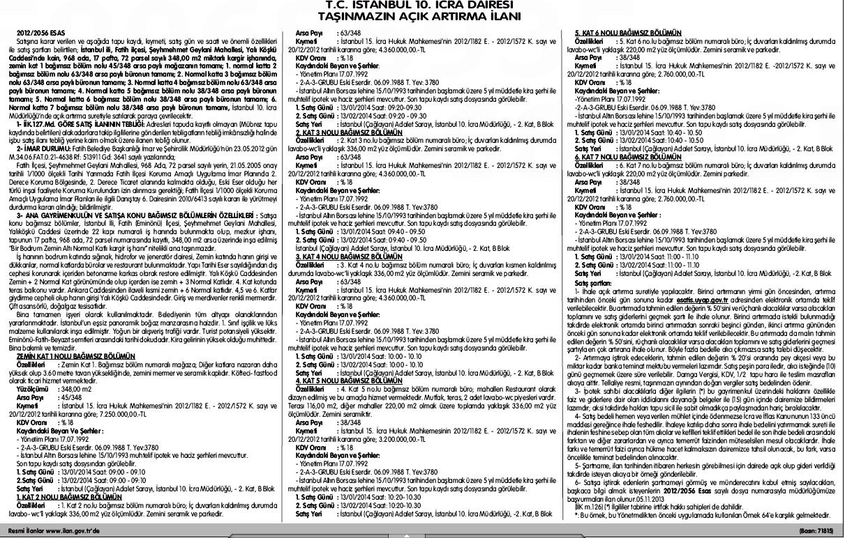 İstanbul 10. İcra Dairesi Fatih'te 6 katlı iş hanındaki bölümleri ayrı ayrı satışa çıkardı. Toplam tahmini bedeli 29 milyon 50 bin lira olan ihalede fiyatlar 2 milyon 760 bin lira ile 7 milyon 250 bin lira arasında farklılık gösteriyor. İhale 13 Ocak 2014 günü saat 9.00 ile 11.10 arası Çağlayan Adliyesi'nde yapılacak. Alıcı çıkmaması durumunda ikinci satış 13 Şubat 2014 günü aynı yer ve saatte gerçekleştirilecek.
