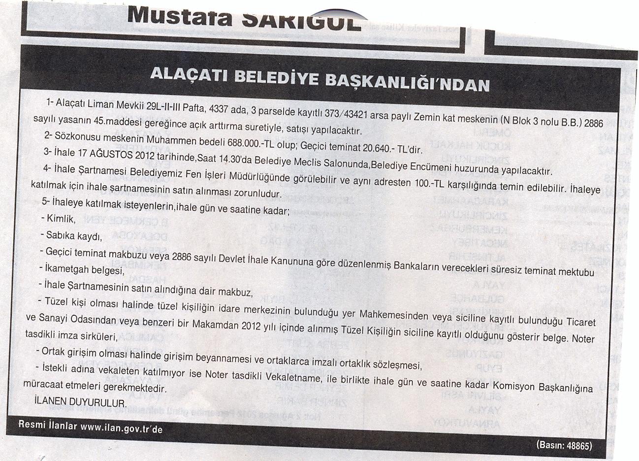 İzmir Alaçatı Belediye Başkanlığı, Alaçatı Liman bölgesinde yer alan dubleks konutu 750 bin lira tahmini bedelle satışa çıkardı. Geçici teminat bedeli 22 bin 500 lira olarak belirlenen ihale 17 Ağustos 2012 günü saat 14.20'de Alaçatı Belediyesi Encümen Salonu'nda yapılacak.