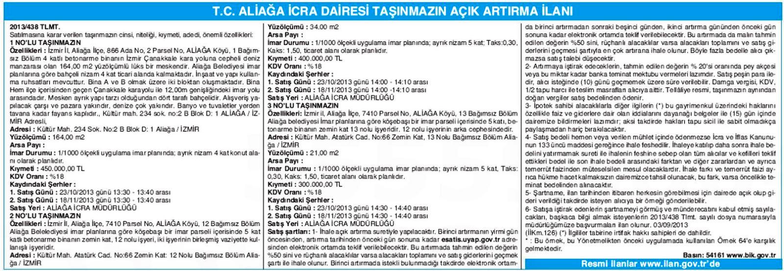 Aliağa İcra Dairesi, Aliağa Köyü'nde 450 bin lira değerinde bir konut ile 400 bin lira ve 300 bin lira değerinde iki iş yerini satışa çıkardı. Taşınmazların satışı 23 Ekim 2013 tarihinde saat 13.30'da Aliağa İcra Dairesi'nde gerçekleştirilecek.