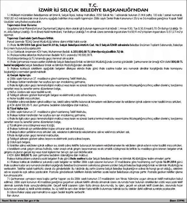 İzmir Selçuk Belediyesi, İsabey Mahallesi sınırlarında kalan 19 bin 301 metrekarelik arsayı 6 milyon 350 bin lira tahmini bedelle satışa çıkardı. Geçici teminatı 190 bin 500 lira olan taşınmaz uygulama imar planında konut dışı kentsel çalışma alanı olarak gözükmekte. İhale 16 Eylül 2014 günü saat 14.30'da Selçuk Belediyesi'nde gerçekleştirilecek.